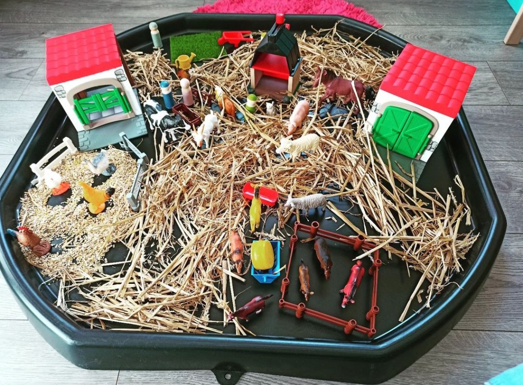 bac sur le thème de la ferme : le toucher : différentes matières avec la paille, le grains ; la vue : mise en scène et couleurs ; l’odorat : odeur de la paille ; enrichissement du vocabulaire avec les animaux ; l’ouïe : bruit de la paille, du grain lorsqu’il tombe, imiter le cris des animaux présents